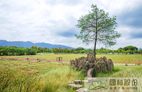 旁邊的一個(gè)樹島,用柴火和鋼管做出“鳥巢”形狀,雖稍顯“凌亂”,但卻顯得分外自然;再前方的一個(gè)樹島,增加“五指”塑石景觀,遠(yuǎn)遠(yuǎn)看去,好像一只大手托舉著大樹;穿過田間小路,來到幾棵大樹組成的樹林,錯(cuò)落有致的景石形成一個(gè)自然的圍合空間,林間小路用舊木頭鋪成,道路兩邊用紫色鼠尾草、刀茅等植物巧妙搭配出清新的花境,坐在樹下的石頭上小憩,看著孩子們在追逐嬉戲,仿佛回到了兒時(shí)和小伙伴在村口大樹下游玩打鬧的時(shí)光,關(guān)于故鄉(xiāng)的回憶充盈在心間。