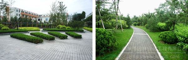 每個(gè)景觀(guān)節(jié)點(diǎn)上,植物的配置方法都是不一樣的,如在下沉廣場(chǎng),主要是以小龍柏、金葉女貞等小灌木片植成方形或弧形,間或點(diǎn)綴石楠、梅樹(shù),看起來(lái)規(guī)整、簡(jiǎn)潔;而在設(shè)計(jì)風(fēng)格為江南園林的南廣場(chǎng)上,是將貴重的造型油松單植,通過(guò)不同的組合,形成三個(gè)風(fēng)格相近的綠島,周邊種植美人蕉、玉簪、竹子,并砌起白墻,上面開(kāi)圓形拱門(mén)或圓窗,散發(fā)出詩(shī)意江南的靜謐和婉約氣息?!坝雾降朗秦灤┱麄€(gè)景觀(guān)的軸線(xiàn),為了形成曲徑通幽的景觀(guān)效果,我們將對(duì)植、孤植、叢植都多種方法結(jié)合運(yùn)用,特別是在三叉路口,多種植海棠、櫻花、杏花等,一方面,花開(kāi)的時(shí)候,綠葉間繁花點(diǎn)點(diǎn),會(huì)吸引人們不斷向前探尋更多的美景;而花落之后,茂密的枝葉又形成隱隱約約的視覺(jué)感受,前方轉(zhuǎn)過(guò)彎后風(fēng)景什么樣,又讓人很想去看看?!备呓?jīng)理笑著說(shuō)。