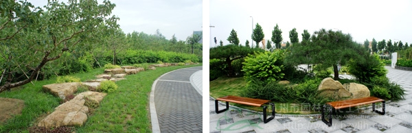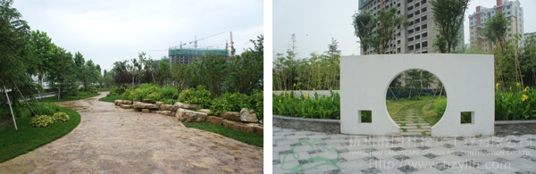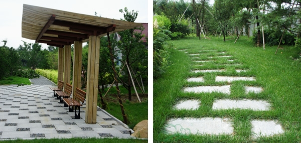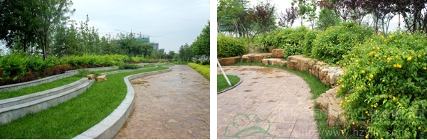 而在道路十字路口的節(jié)點(diǎn)處,則主要是用10cm×10cm的小花崗巖鋪地,鋪出來(lái)的路面整潔、平坦,看似簡(jiǎn)單,實(shí)則對(duì)施工技術(shù)要求相當(dāng)高。草坪中的地面鋪裝,則采用花崗巖汀步,用錯(cuò)縫鋪裝法,兩塊花崗巖之間用草皮鑲嵌,就像給每塊花崗巖鑲了一道綠邊,與旁邊的草坪和諧地融為一體。貫穿整個(gè)工程的游憩步道,全部采用“人字形”的鋪裝方法,中間用透水磚、兩邊以花崗巖鑲邊,透水磚價(jià)格不高,用以鑲邊的花崗巖是利用了鋪裝中剩余的邊料,雖然用料簡(jiǎn)單,但通過(guò)對(duì)技術(shù)的嚴(yán)格要求,鋪出的路面卻整潔而不失韻味,是一種實(shí)用、環(huán)保、節(jié)約的做法。