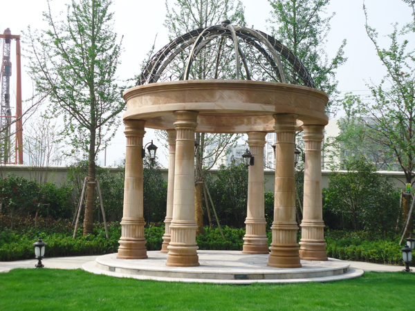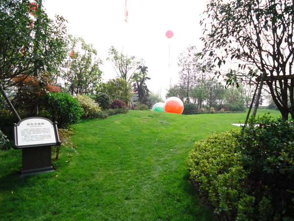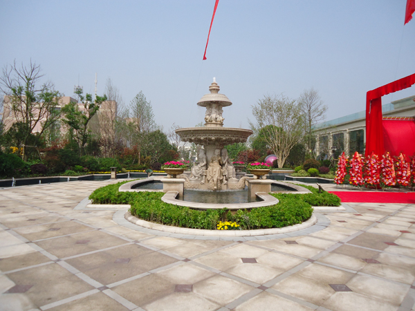 更引人注目的,還有銷(xiāo)售展示中心前面的雕塑?chē)娙?,該噴泉運(yùn)用花崗巖整石雕刻拼接而成,工藝極其復(fù)雜,自上而下不斷灑落的水花,營(yíng)造出一片清涼;無(wú)以復(fù)加的鏤空鐵藝圓頂繁復(fù)花紋和拱門(mén)的石材立面裝飾的皇家景觀亭,精致中透露出大氣;潺潺溪流、霧氣繚繞的人工溪澗,如夢(mèng)似幻;大面積的高爾夫果嶺草坪蜿蜒起伏,華貴雍容……