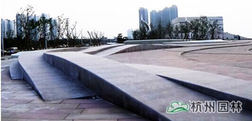 廣場根據(jù)功能不同,分為七大觀賞區(qū),分別是露天劇場、雕塑小品、人行路橋、活動(dòng)廣場、異形種植池、滑板坡道、擋浪墻和波浪形臺(tái)階。