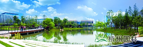 華為杭州二期生產(chǎn)基地景觀工程位于杭州市濱江區(qū)。走進(jìn)工程現(xiàn)場,只見一棵棵銀杏、香樟、桂花生長得郁郁蔥蔥,昭示著無限的生機與活力;風(fēng)格多樣的鋪裝,相映成趣,蜿蜒延伸;波光粼粼的人工湖中,幾只黑天鵝悠閑地游來游去,是風(fēng)景的主角;色彩繽紛的黃色、白色、粉色花朵,營造出夏日的花海景觀……不是公園勝似公園的園林美景,營造出一個郊外原野般的自然空間。