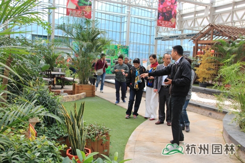 第二天,考察團在杭州市園林綠化股份有限公司總裁張炎良、副總裁丁旭升的陪同下參觀了畫境·青山湖花園中心。該花園中心是一個集園藝產(chǎn)品研發(fā)、展示和推廣的現(xiàn)代園林高新技術(shù)平臺,致力于打造庭院設(shè)計、咨詢、建造、養(yǎng)護等各類功能綜合的一站式園藝服務(wù)中心。項目有近3000畝配套生產(chǎn)基地,12000平米研發(fā)與生產(chǎn)溫室,以及室內(nèi)情景展示區(qū)、園藝展示區(qū),室外陳列展示區(qū)、應(yīng)用展示區(qū)等多個功能區(qū)塊。其中,用于室內(nèi)園藝展示的4000平方米的展覽溫室,引進荷蘭PRINS溫室技術(shù),實現(xiàn)對溫度、光照等全智能控制,是一個技術(shù)含量極高的節(jié)能、環(huán)保型現(xiàn)代溫室。