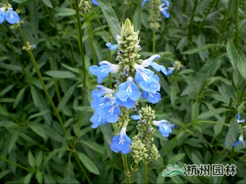 天藍鼠尾草,花天藍色,開花植株高達1米5,花期春季。喜溫暖,陽光充足的環(huán)境,不擇土壤,耐干旱,但不耐澇,特別喜石灰質(zhì)豐富、或沙性、排水良好的土壤。