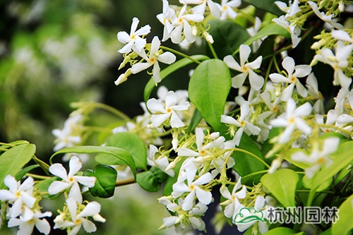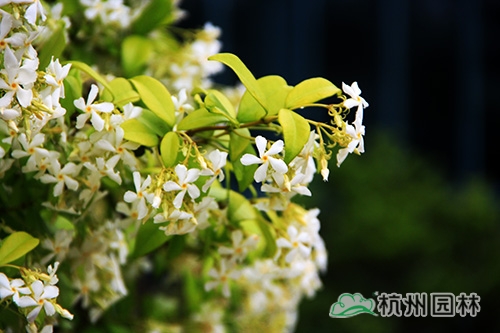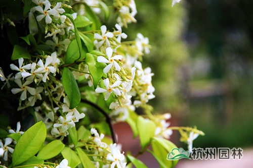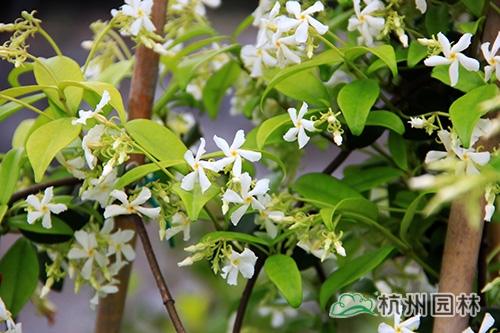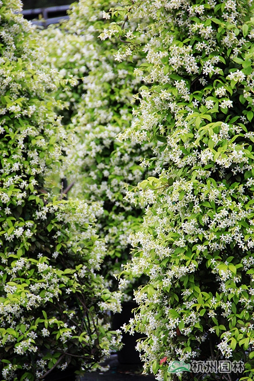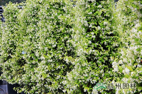 意大利白花絡石藤(Rhyncospermum jasminoides),俗稱風車茉莉,為夾竹桃科的常綠藤本,莖赤褐色,幼枝被黃色柔毛長,有氣生根。常攀緣在樹木、巖石墻垣上生長,是一流的藤蔓植物,四季常綠。開花期在夏季,5月進入盛花期,開花量極大,有茉莉的香味,聞起來沁人心脾。