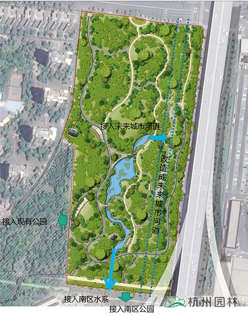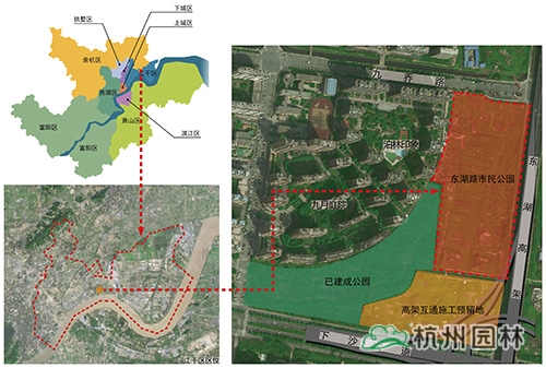 江干區(qū)東湖路市民公園位于東湖路與九喬街西南角,毗鄰九月庭院和泊林印象小區(qū),是江干區(qū)“一帶生態(tài)功能區(qū)”的“運河—錢塘江—東湖路”U型生態(tài)軸的重要節(jié)點。結(jié)合已建成公園和高架互通施工預(yù)留地,對東湖路市民公園進(jìn)行統(tǒng)一規(guī)劃。