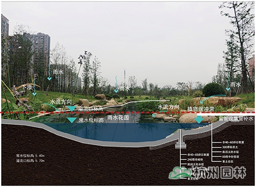 旱溪布置于帶狀綠地低洼處。設(shè)計時仿造自然界中干涸的河床,配合濕生植物的營造,在意境上表達(dá)出溪水的景觀。降雨時可減緩地表徑流,起到緩排作用。旱溪底部接盲管,將水導(dǎo)入中央湖區(qū),進(jìn)行儲存。