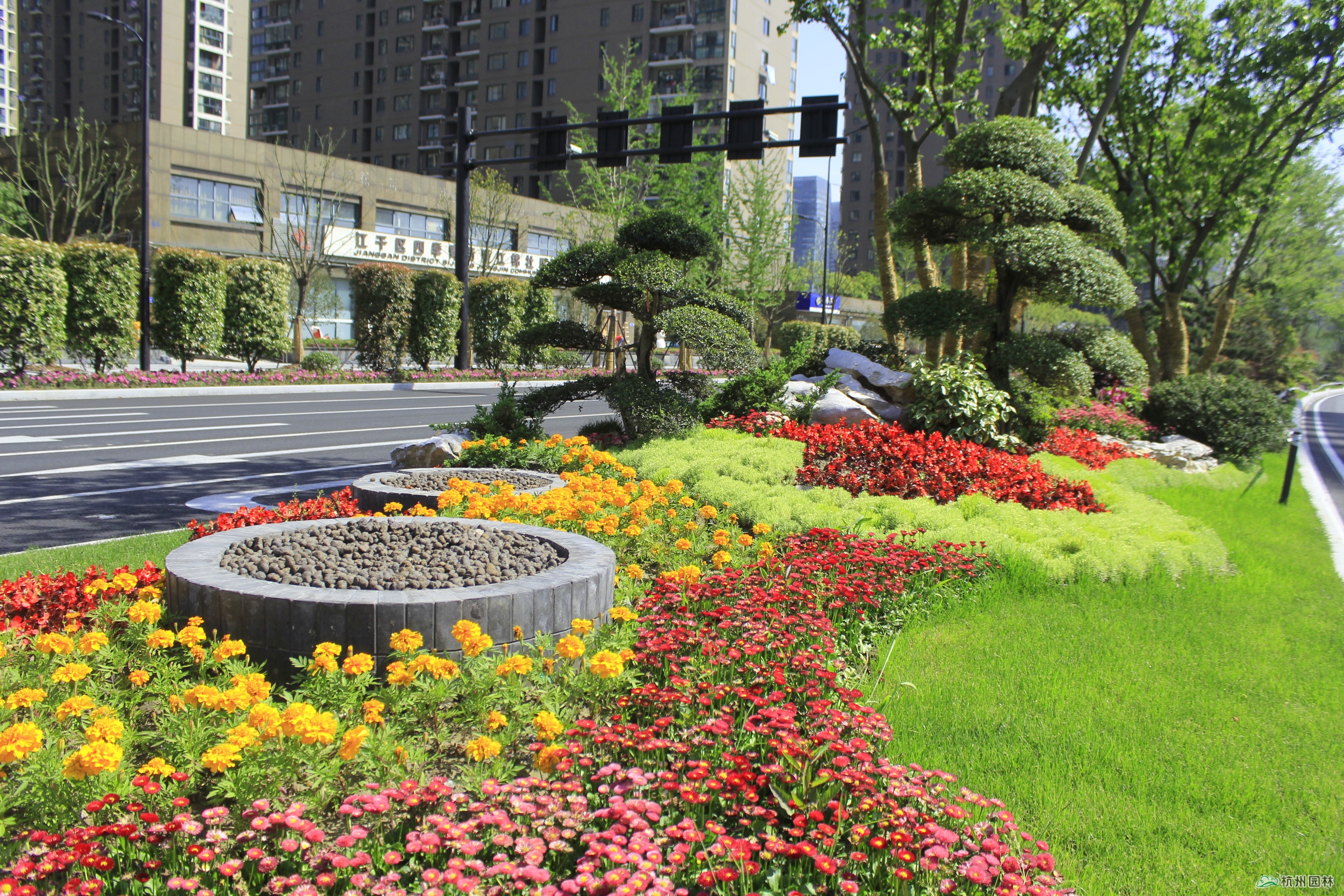 在道路十字路口及一些重要節(jié)點,則通過造型樹、球類植物、景石等的有機(jī)結(jié)合,采用盆景化的造園手法,景觀效果獨具特色。從而使得新塘路成為四季常綠、三季彩葉、全年花開不斷的“最美”迎賓大道。