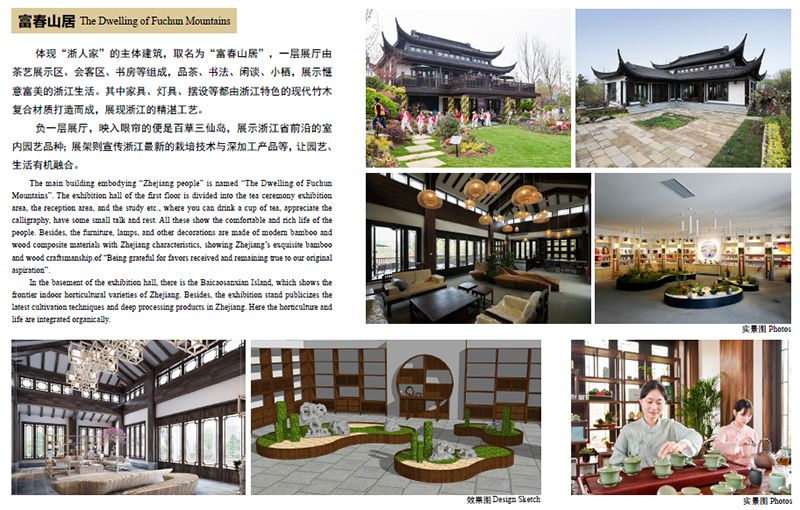 浙江園內(nèi)體現(xiàn)“浙人家”的主體建筑取名為“富春山居”,該建筑以浙派民居為原型,飛檐翹角,格局大氣,盡顯浙江風情。深化這個建筑單體,團隊做了很多功課,花了許多心思,考察了許多浙江特色民居,在充分運用現(xiàn)代建筑材料與結(jié)構(gòu)的基礎(chǔ)上,通過對浙江傳統(tǒng)民居建筑的經(jīng)典片段提取和抽象提煉,賦予這些元素和符號以新的意義,構(gòu)建出浙江傳統(tǒng)民居的新風貌。它不是對傳統(tǒng)民居建筑的照抄照搬,而是繼承和創(chuàng)新,設(shè)計了一棟獨一無二的建筑。