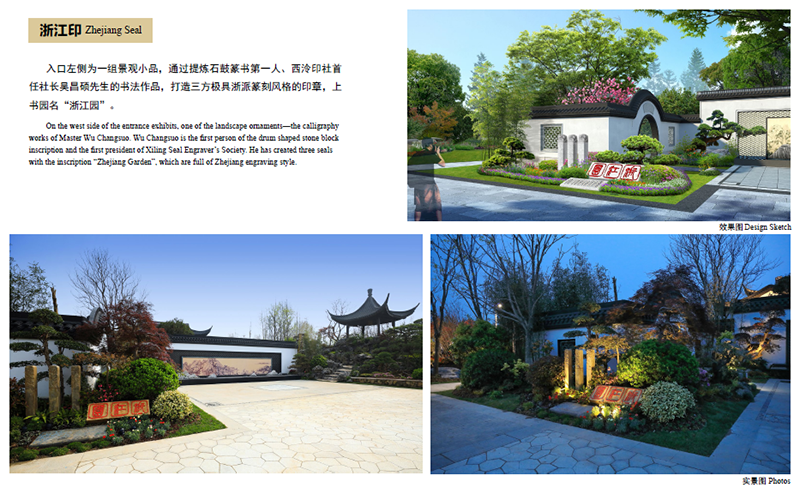 位于浙江園主入口西側(cè)的景觀小品“浙江印”,提煉自石鼓篆書第一人、西泠印社首任社長吳昌碩先生的書法作品,三方極具浙派篆刻風格的印章上,“浙江園”三個字,干凈、利落,古樸、大氣。這幅美景的背后,是深化設(shè)計團隊數(shù)次往返西泠印社,從無數(shù)的篆刻名家作品中挑選、比對,決定采用最能代表浙江篆刻藝術(shù)的吳昌碩先生字體,從中找出“浙”、“江”、“園”三個字,在設(shè)計圖中反復(fù)比對,調(diào)整位置、大小,最終確定下來。