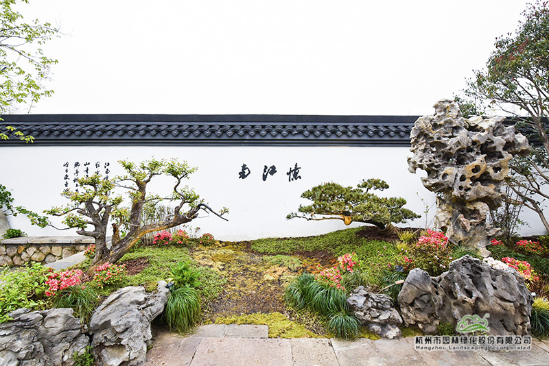 再往里走,富春山居照壁前的造型黑松和紅花檵木,一左一右,遙相呼應(yīng),樹姿優(yōu)美,枝干舒展,仿佛熱情歡迎遠道而來的客人。這兩棵樹,是深化設(shè)計團隊跑遍全國重要苗圃挑選回來的,讓最美的一面呈現(xiàn)在游客面前。