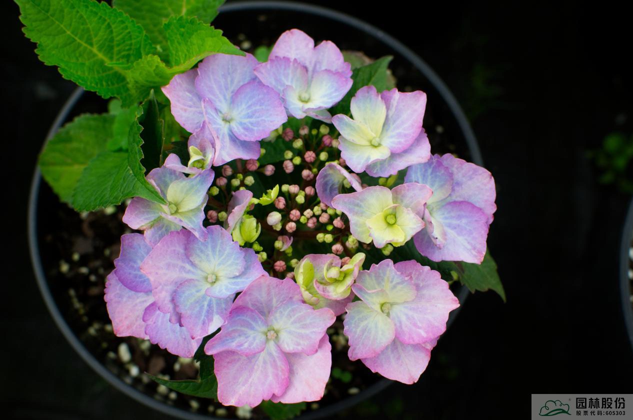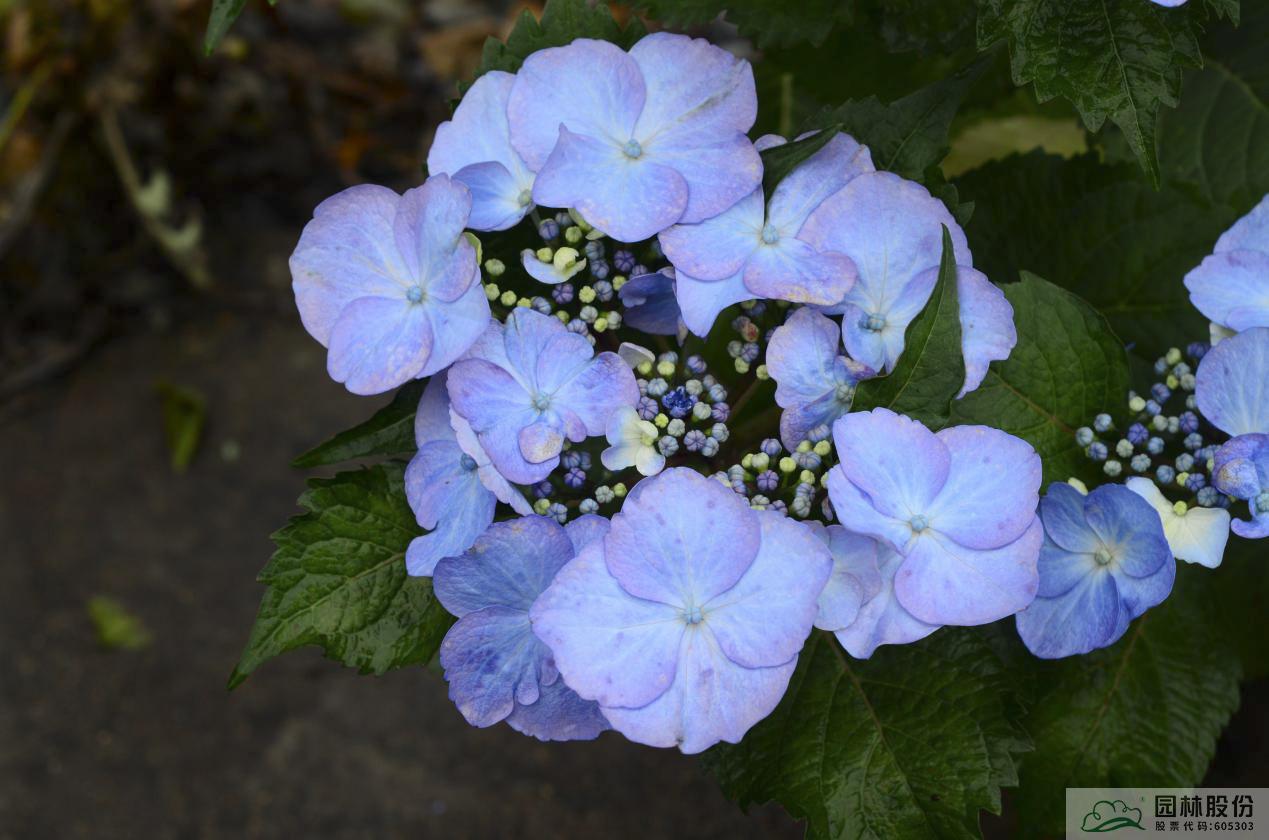 大葉繡球品種間雜交品種;葉片卵形,中綠色;盤狀花,萼片(花瓣)巨大,花色為深紫粉色至鮮紫藍(lán)色,添加調(diào)藍(lán)劑時(shí)可變?yōu)樯钭纤{(lán)色?;ㄩ_時(shí),宛如一只只蝴蝶在枝頭翩躚,靈動(dòng)多姿。杭州5月上旬開花,可延續(xù)至6月下旬。