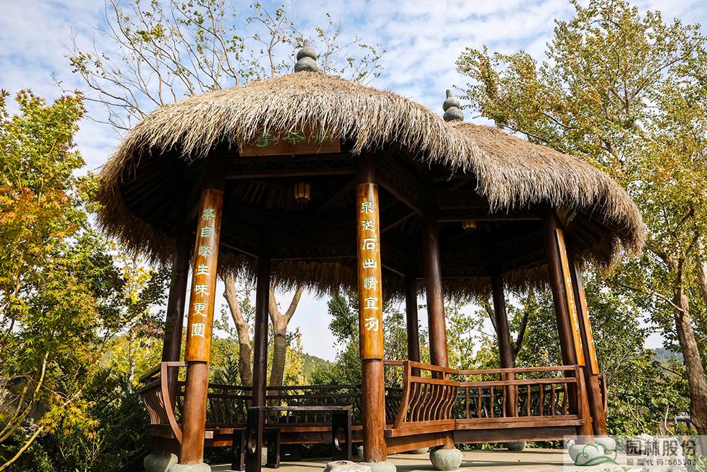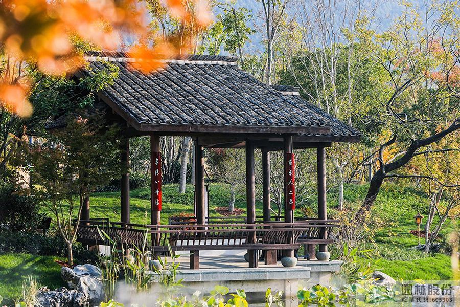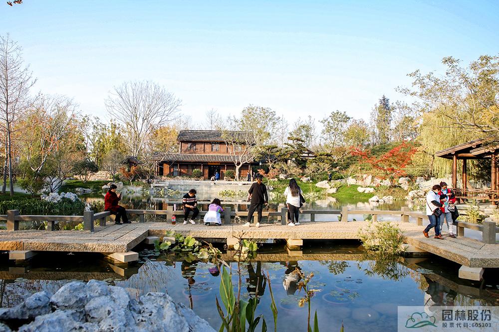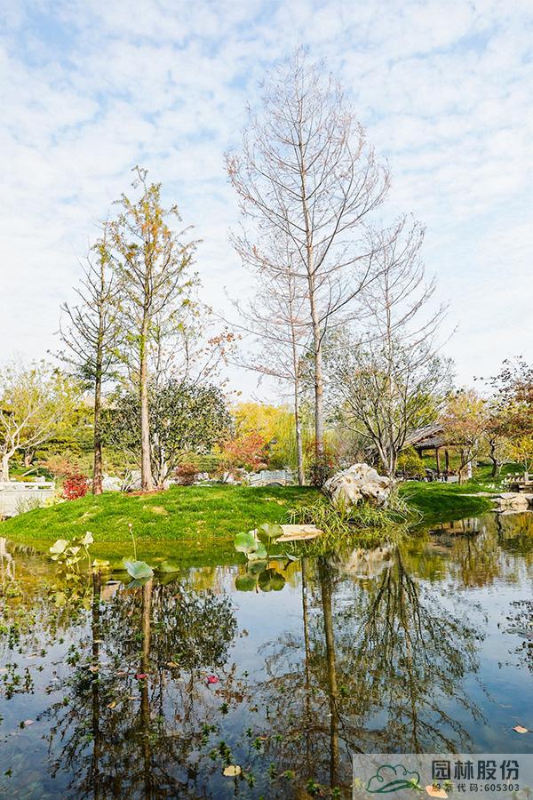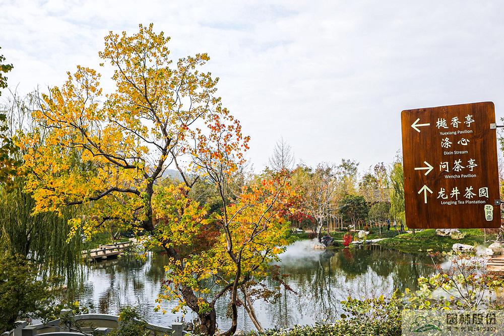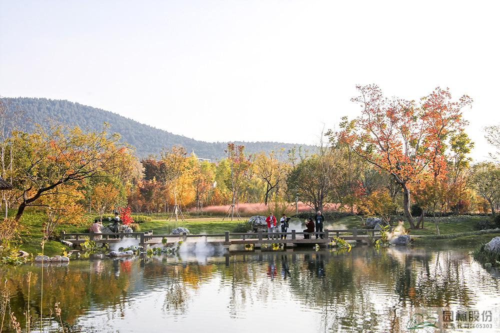 契合展區(qū)主題的樾香亭臨湖而立,雙坡屋面,八柱敞亭,柱子上書(shū)五言聯(lián)“魚(yú)樂(lè)人亦樂(lè),泉清心共清”,盡顯悠閑舒適的情趣。在亭內(nèi)憑欄而坐,側(cè)耳聽(tīng)風(fēng)雨,迎風(fēng)嗅花香。抬頭遠(yuǎn)望,荷葉亭亭的水面上,有魚(yú)兒在水中嬉戲;曲折的長(zhǎng)橋上,游人在漫步觀景;水岸邊,銀杏、三角楓、烏桕等色彩繽紛,編織出一幅深秋的美麗畫(huà)卷。